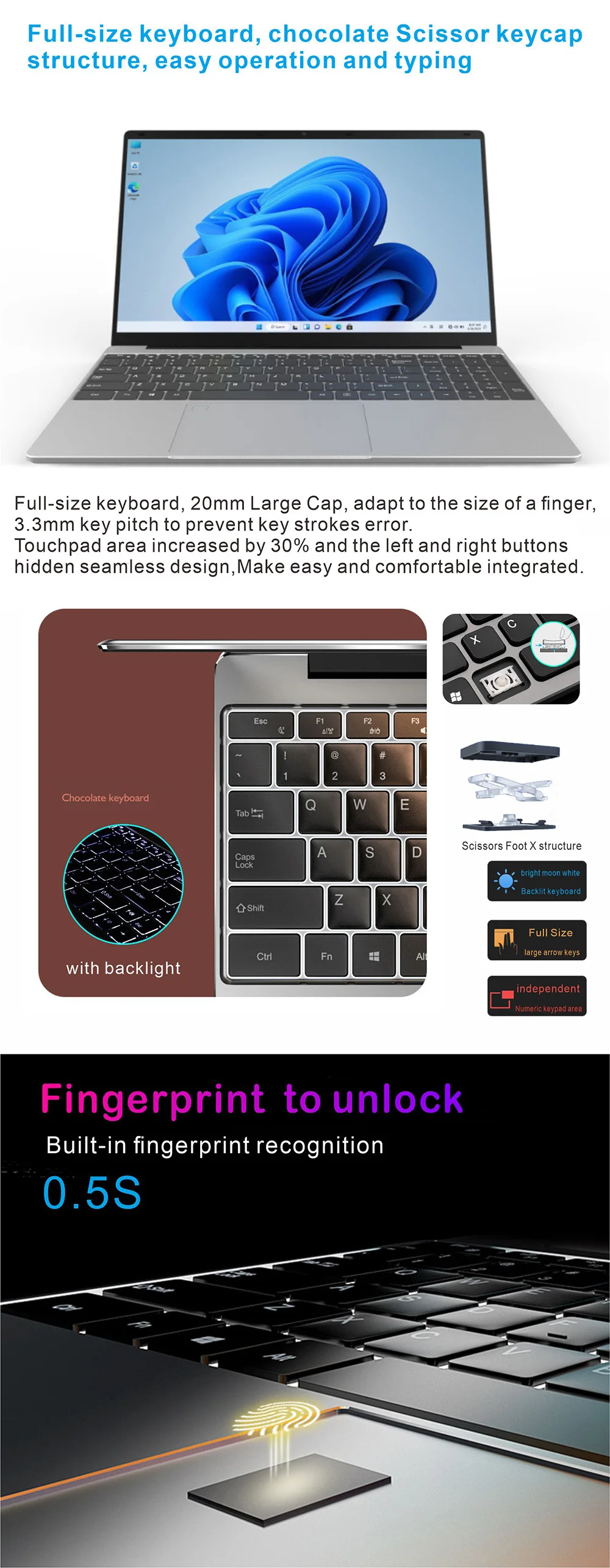 Full-size keyboard, chocolate Scissor keycap structure, easy operation and typing.