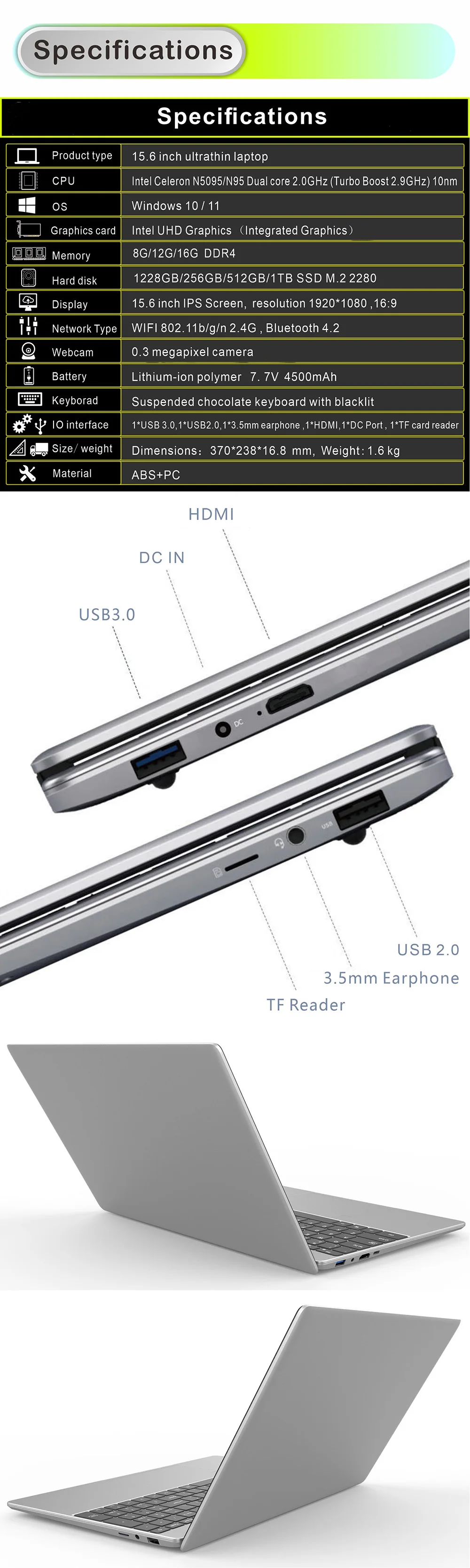 Ports USB 3.0, USB 2.0, HDMI, TF card reader, Headphone jack, DC‑in